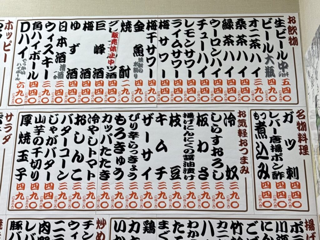 さてさてお次は何をツマみますかと改めて壁一面のメニューたちとにらめっこ。