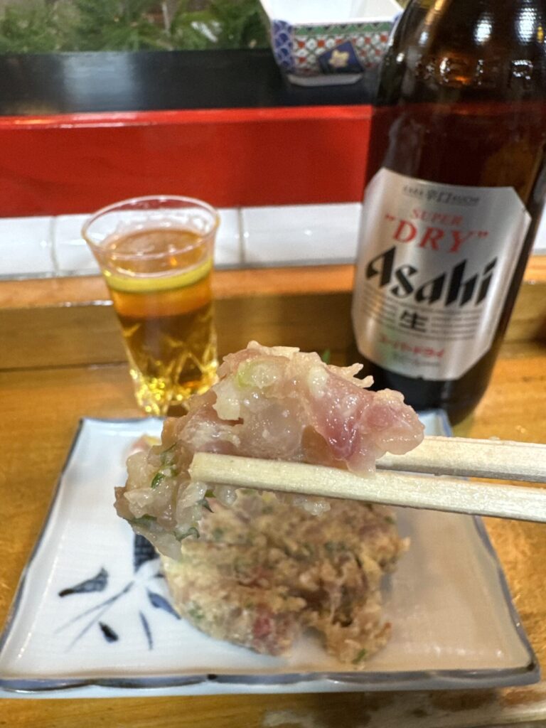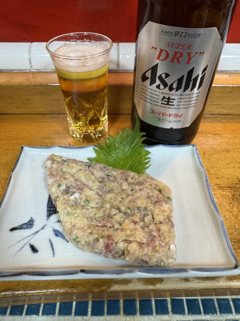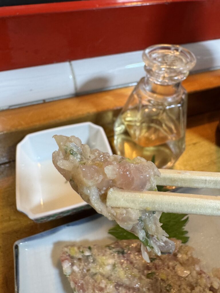 なめろうは新鮮なアジを叩きすぎず、ちょうどの食感を残すように丁寧に叩きあげられた、まさに大将の芸術作品。
