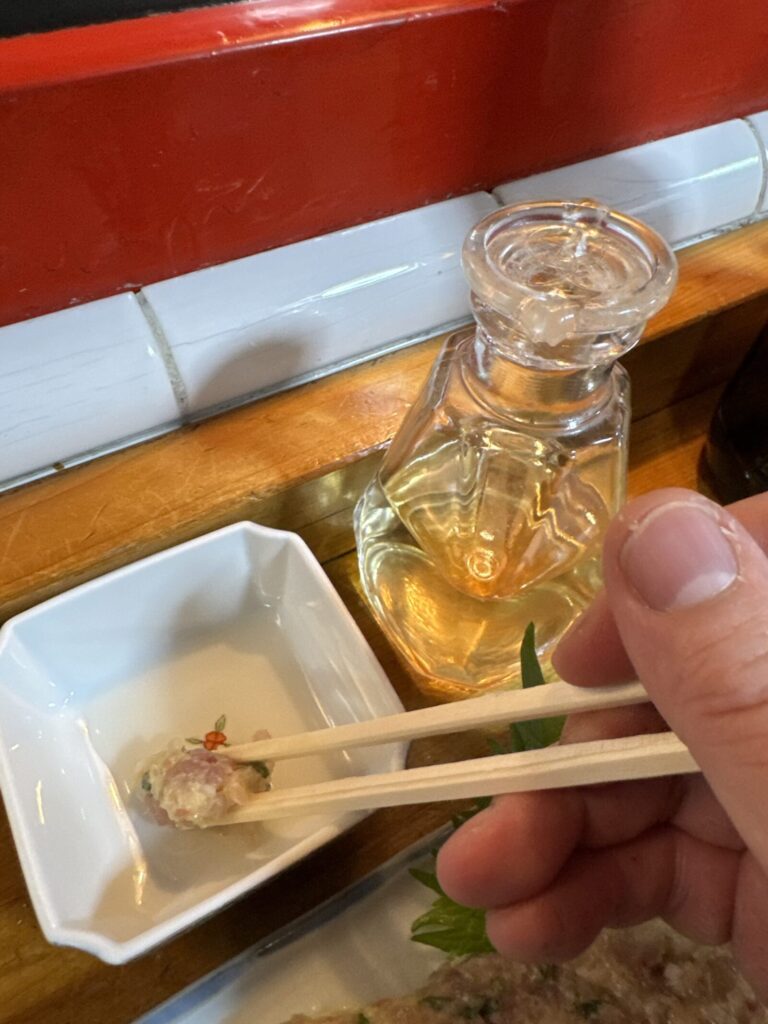 なめろうはそれ自体に味噌で味が付いているので、そのままいただくかちょろっと醤油を垂らすのがいつもの食べ方だが、
