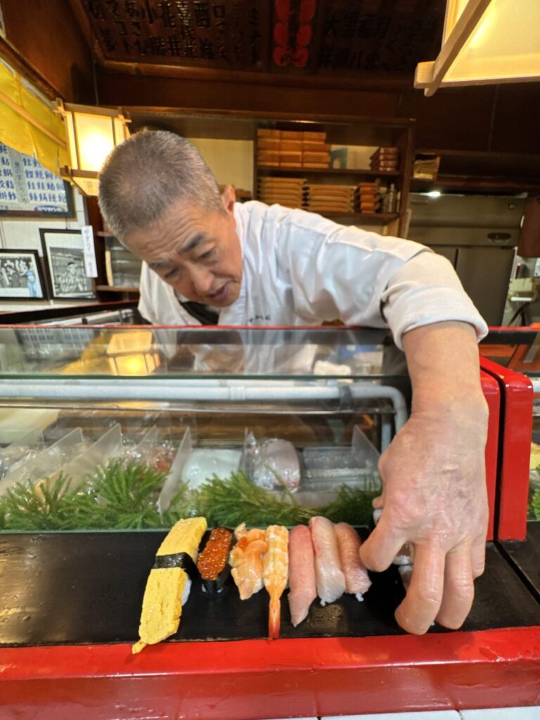 上握りをお願いしますっ!と発声すると、目の前に整列したのはご覧の通りの7貫の握りと鉄火巻きのコンビネーション。