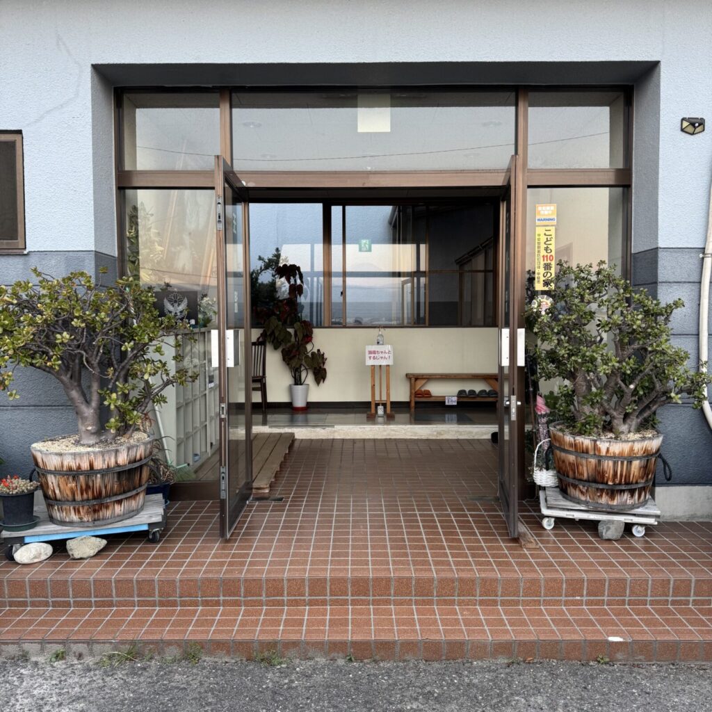車を停め、開け放たれた玄関にエントリーすると手指消毒台のメッセージが